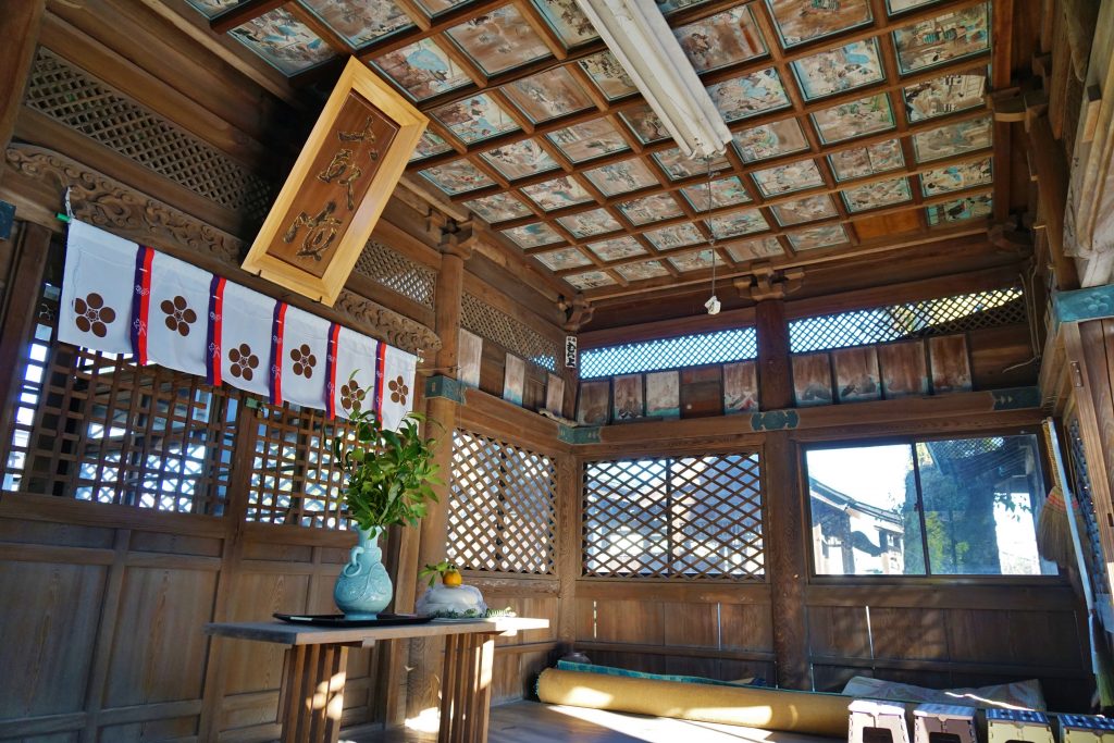 拝殿内には大絵馬と社額、長机の上に御神酒と昆布とスルメがあります。